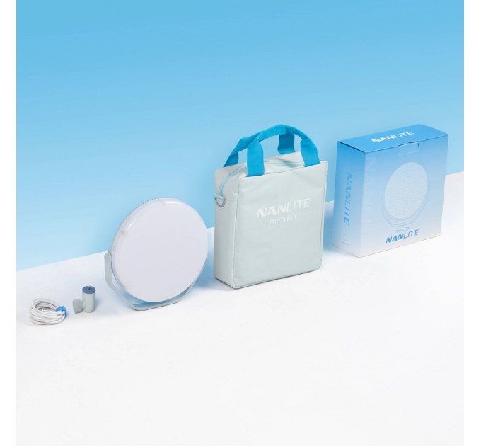 Светодиодная панель Nanlite miro 60c RGB представлена как стильный круглый источник света с широкими возможностями цветопередачи, управления и питания. Модель miro 60c больше версии 30c — её диаметр составляет около 22 сантиметров, а вес — 0,74 кг. Этот осветительный прибор тяжелее, но значительно ярче своей младшей версии. При этом miro 60c остаётся компактным и удобным в использовании осветителем, способным воспроизводить любые цвета благодаря светодиодной системе Nebula C4. Дополнительное преимущество miro 60c — увеличенный круглый форм-фактор, который также имеет магнитный рассеиватель, создающий мягкий, приятный свет. Питание осуществляется от сети переменного тока, а также опционально от аккумуляторов типа NP-F или внешних аккумуляторов USB-C. Помимо магнитного рассеивателя, в комплект входят кабель USB-C, крепление типа «Baby» 5/8 дюйма с резьбой 1/4"-20 для установки на стойку и удобная сумка для переноски.